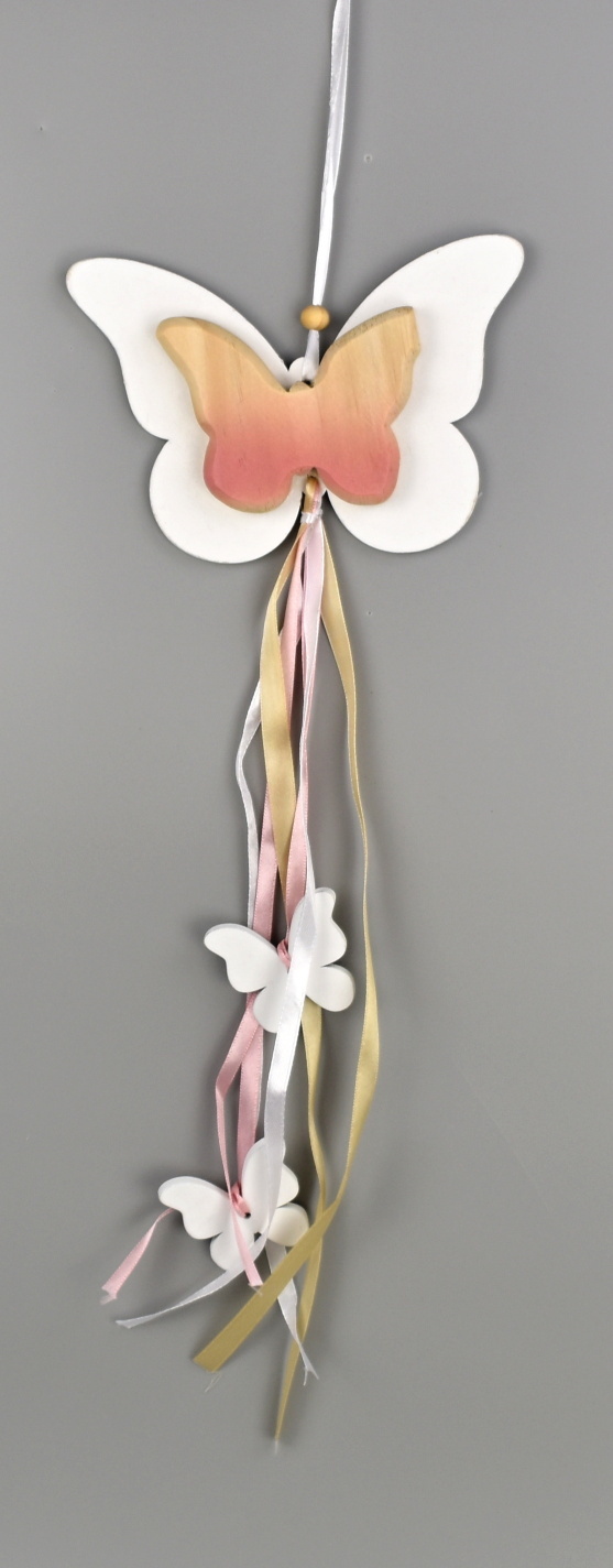 Motýl dřevěný na zavěšení se stuhami. číst celé