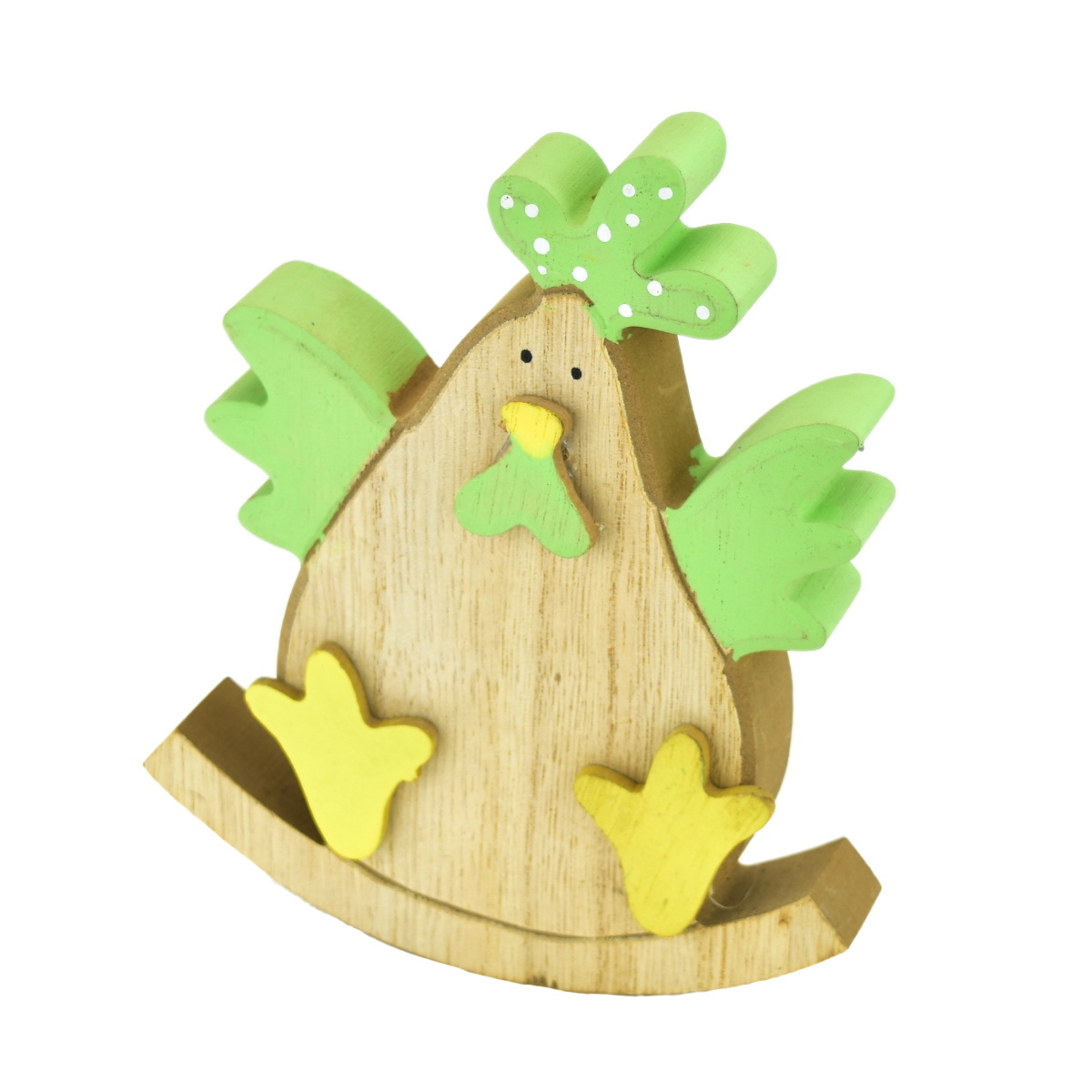 Naše Velikonoční dřevěná slepička na houpačce je dokonalým doplňkem pro váš sváteční stůl. Tato kvalitně zpracovaná hračka je vyrobena z překližky a má rozměr 15 x 12,5 cm (v. x š.). Slepička na houpačce je zelená a má roztomilá křidélka, která ji dodávají postavičce půvab a živost.