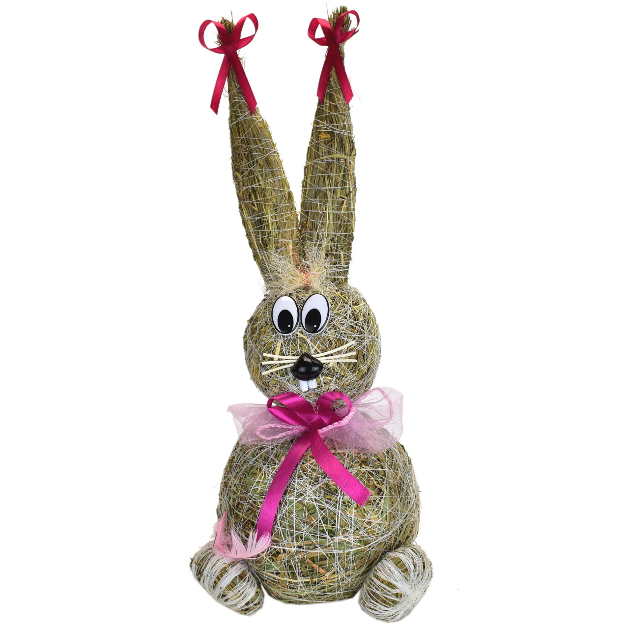 Roztomilý ručně vyráběný velikonoční zajíc je ideálním doplňkem pro vaše velikonoční dekorace. Tento zajíc je vyroben ze slámy a zdoben růžovými mašličkami a růžovou stuhou, které mu dodávají zvláštní půvab. Jeho veselé provedení dokáže okamžitě vyvolat úsměv na tváři.