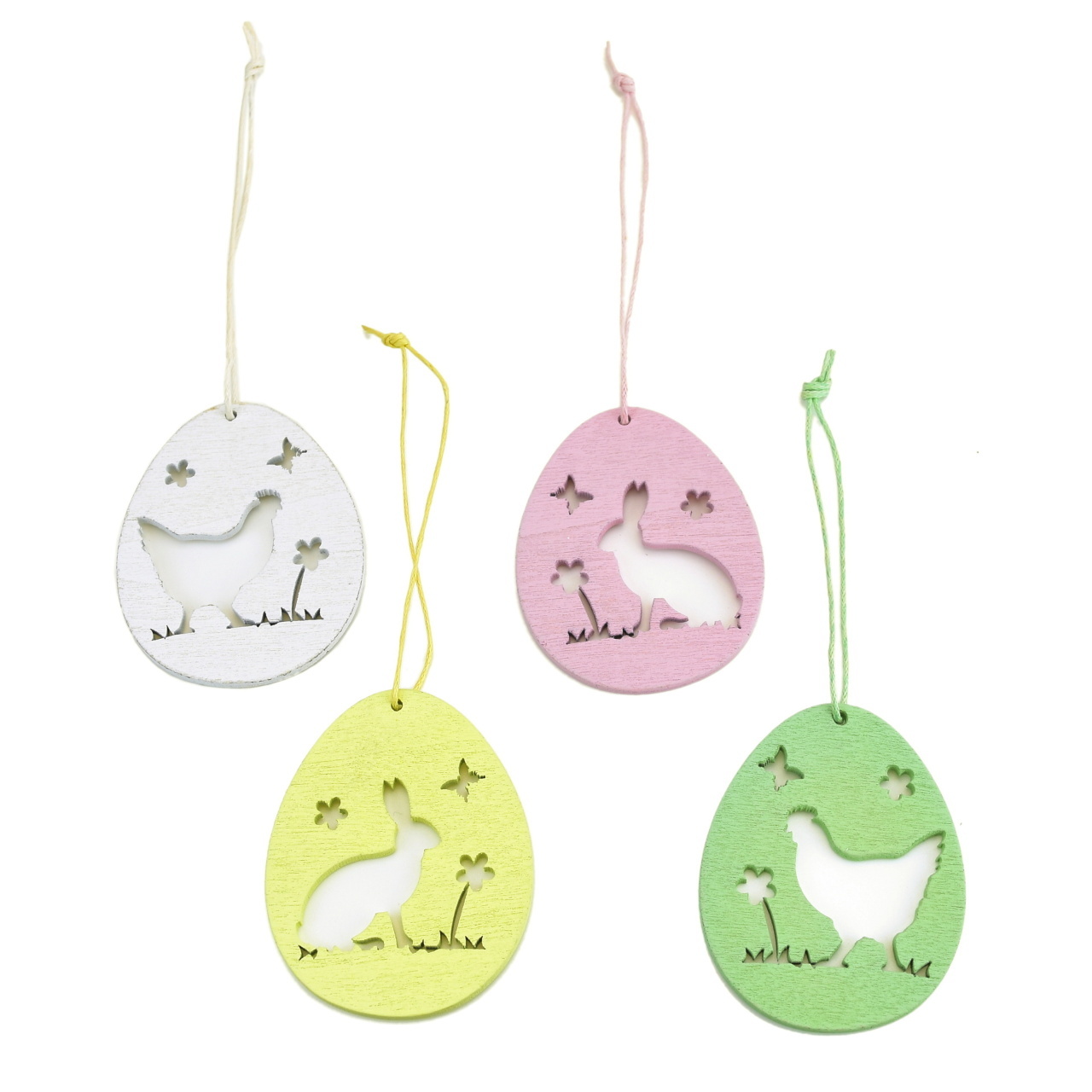 Objevte kouzlo jara a Velikonocí s naší sada čtyř dřevěných závěsných vyřezávaných vajíček. Tento originální kousek je ideální pro zdobení vašeho domova během jarních svátků. Vajíčka jsou vyrobená z kvalitního dřeva a přinášejí do vašeho prostoru přírodní a veselou atmosféru.