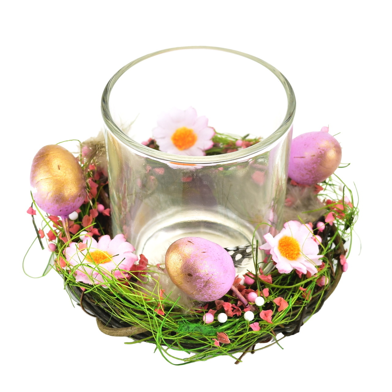 Tento exkluzivní svícen je určen pro čajové svíčky a zdobí ho proutěný věneček se způsobenými vajíčky, peříčky, kytičkami a okvětními lístky. Tyto elegantní prvky přidávají do vaší domácnosti nádech přírody a jedinečnosti.