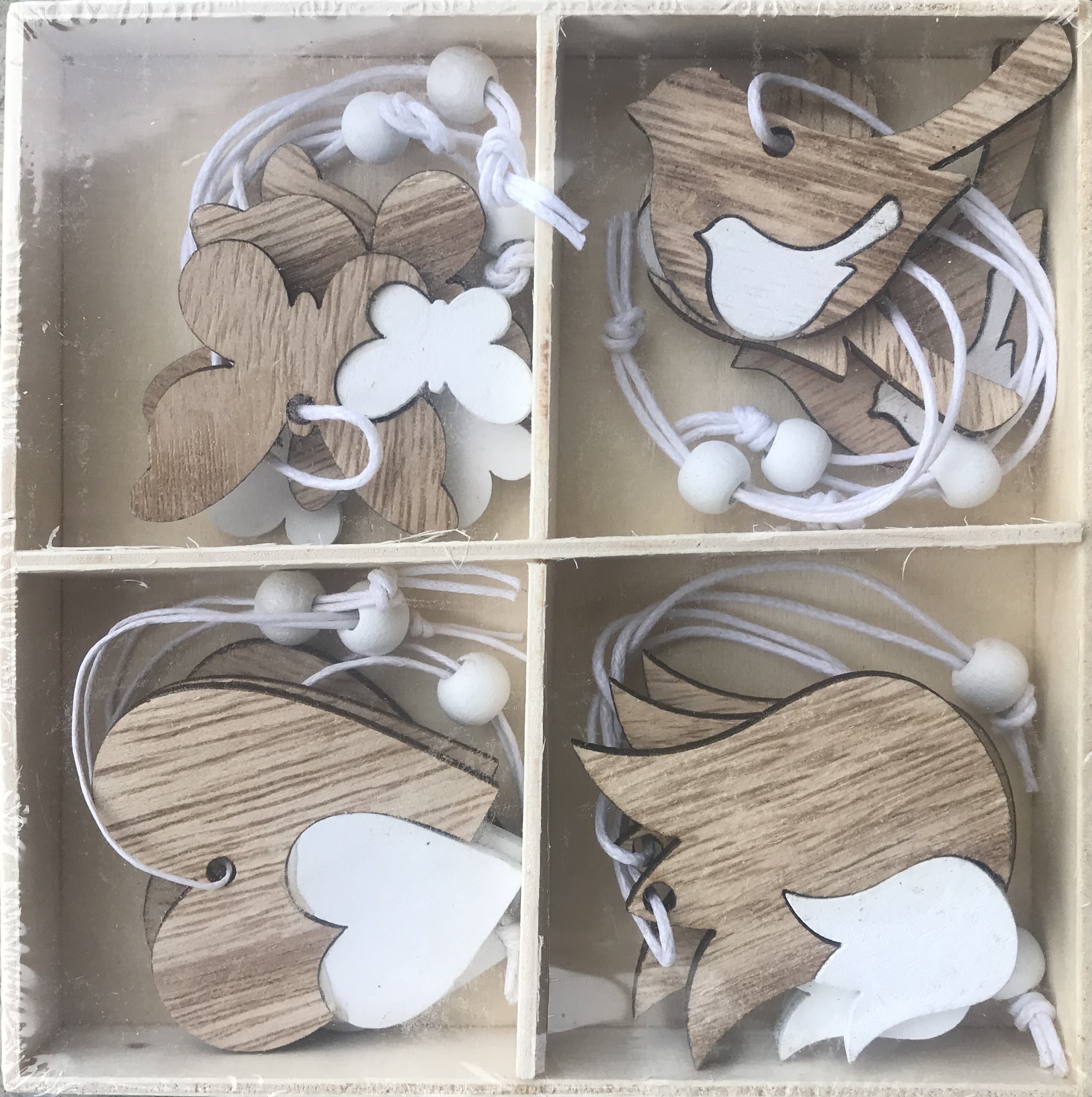Sada dřevěných dekorací k zavěšení 12 ks - 3x srdce, 3x motýl, 3x tulipán, 3x ptáček. Barva - kombinace hnědá s bílou. Materiál - dřevo. Dekorace - šířka 4 - 4,5 cm, tloušťka 0,3 cm, výška 3 - 5 cm.