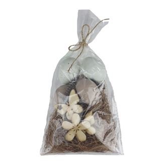 Sada na tvoření.Sada obsahuje vajíčka , přízdoby, trávu.Rozměry : vajíčka mají průměr 5 cm, výšku 4 cm, přízdoby 5 x 0,2 x 4,5 - 5 cm.Barva : kombinace přírodní, hnědá, bílá.Materiál na bázi dřeva, plast, přírodní. číst celé