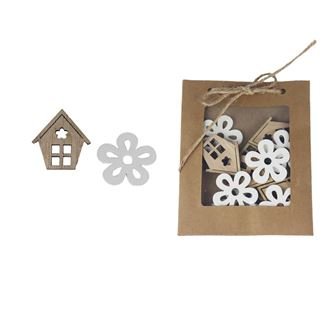 Sada dekoračních přízdob.Sada obsahuje 12 přízdob.Rozměry : 3,3 x 0,2 cm, výška 3,3 - 3,7 cm.Barva : kombinace bílá, hnědá.Materiál na bázi dřeva. číst celé