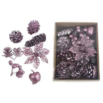 Sada dekoračních přízdob.Rozměry : 2 - 8 x 2 - 3 cm, výška 4 - 7 cm.Barva : růžovo - fialová.Materiál : plast, přírodní. číst celé