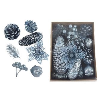 Sada dekoračních přízdob.Rozměry : 2 - 8 x 2 - 3 cm, výška 4 - 7 cm.Barva : modrá.Materiál : plast, přírodní.