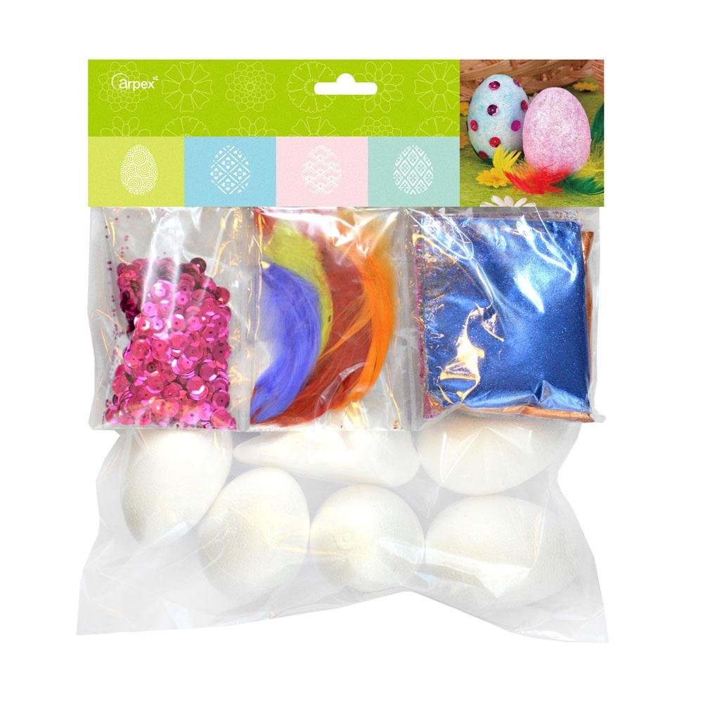Zestaw zawiera: 5 jaj styropianowych 7 cm, 1 zająca styropianowego, brokat sypki w różnych kolorach, piórka i cekiny dekoracyjne. číst celé