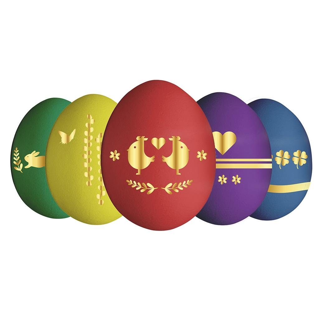 Zestaw do dekoracji pisanek. W opakowaniu znajdują się barwniki w 5 kolorach oraz złote naklejki na jajka w różnych wzorach. Kolory barwników: żółty, czerwony, fioletowy, zielony, niebieski. Gotowy zestaw do zrobienia niebanalnych pisanek. Sposób użycia produktu znajduje się na opakowaniu....