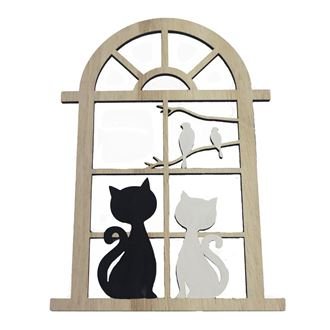 Dekorace okno s kočkami.Rozměry : 16,5 × 23,5 cm, tloušťka 0,5 cm.Barva : kombinace přírodní s bílou, s černou.Materiál na bázi dřeva. číst celé