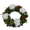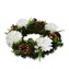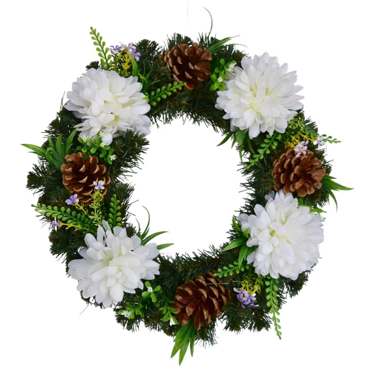 Podzimní věnec s bílými chryzantémami je dokonalou výzdobou na podzimní období. Tento věnec je vyroben z umělého zeleného jehličí a je zdoben čtyřmi květy bílých chryzantém, které doplňují zelené listy, šišky a zelené větvičky s drobnými kvítky. Jeho vnější průměr činí 35 cm.