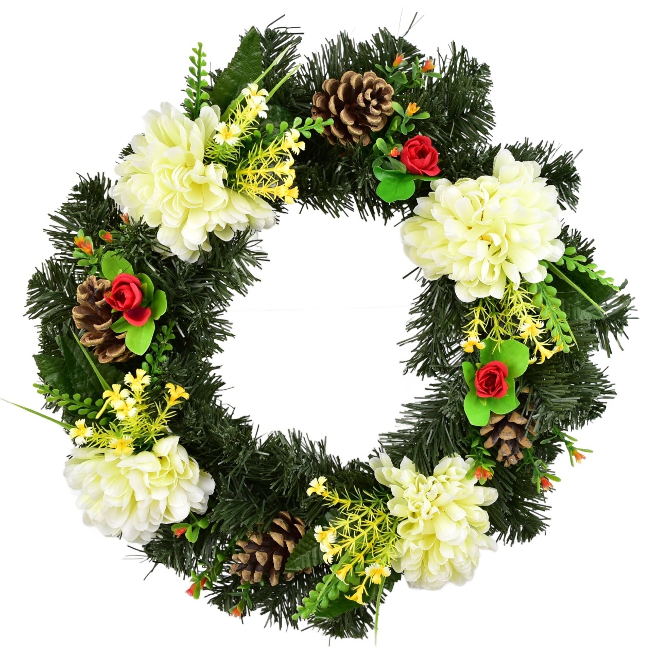 Tento věnec je vhodný jako smuteční výzdoba a dodá vašemu prostoru zvláštní atmosféru. Jeho umělé materiály vám zajistí trvanlivost a údržbu není potřeba.