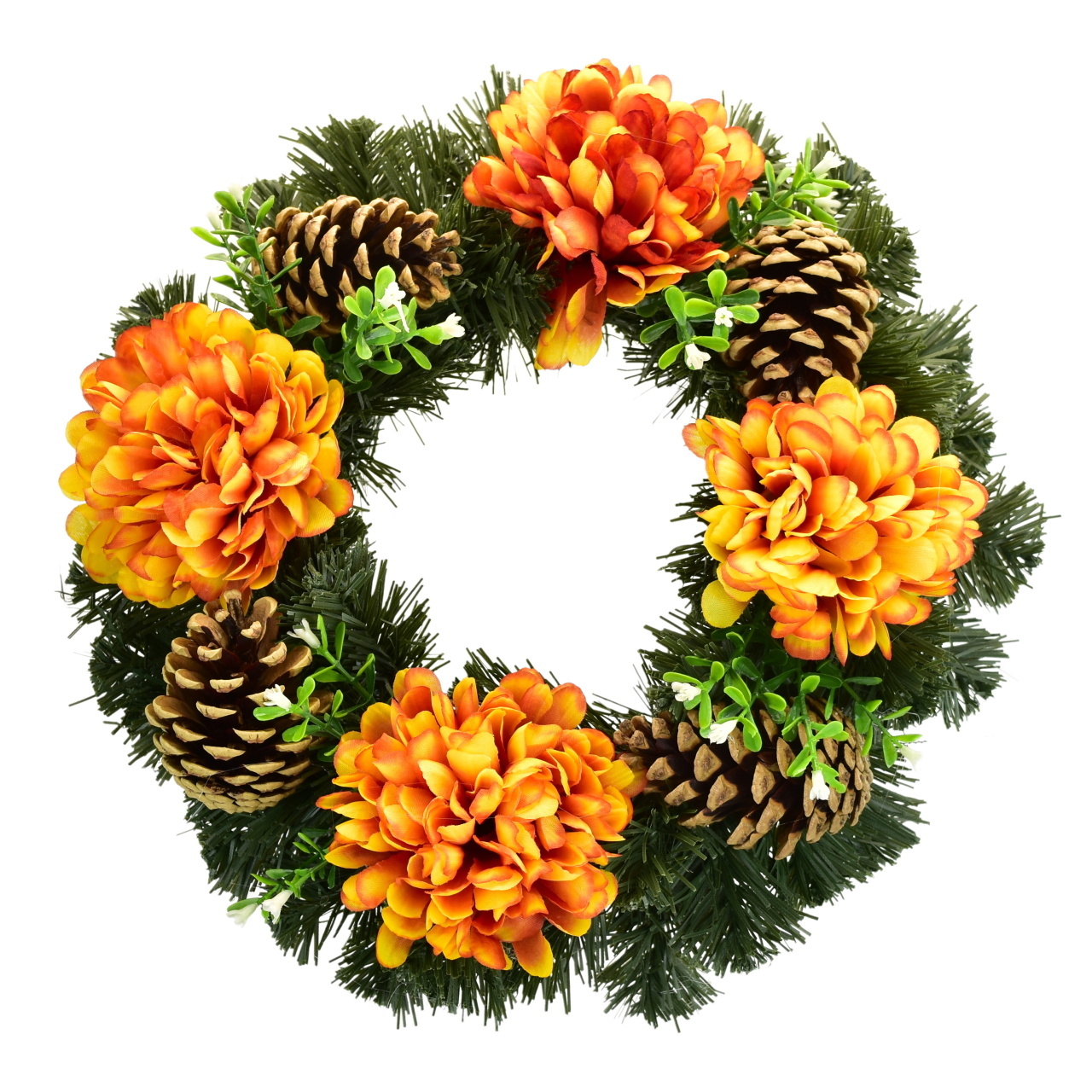 Podzimní věnec s oranžovými chryzantémami je perfektní volbou pro smuteční výzdobu. Tento věnec je vyroben z umělého zeleného jehličí, které je zdobeno čtyřmi květy oranžových chryzantém. Šišky z borovice černé a zelené větvičky s drobnými kvítky přidávají věnci jedinečný vzhled a texturu.