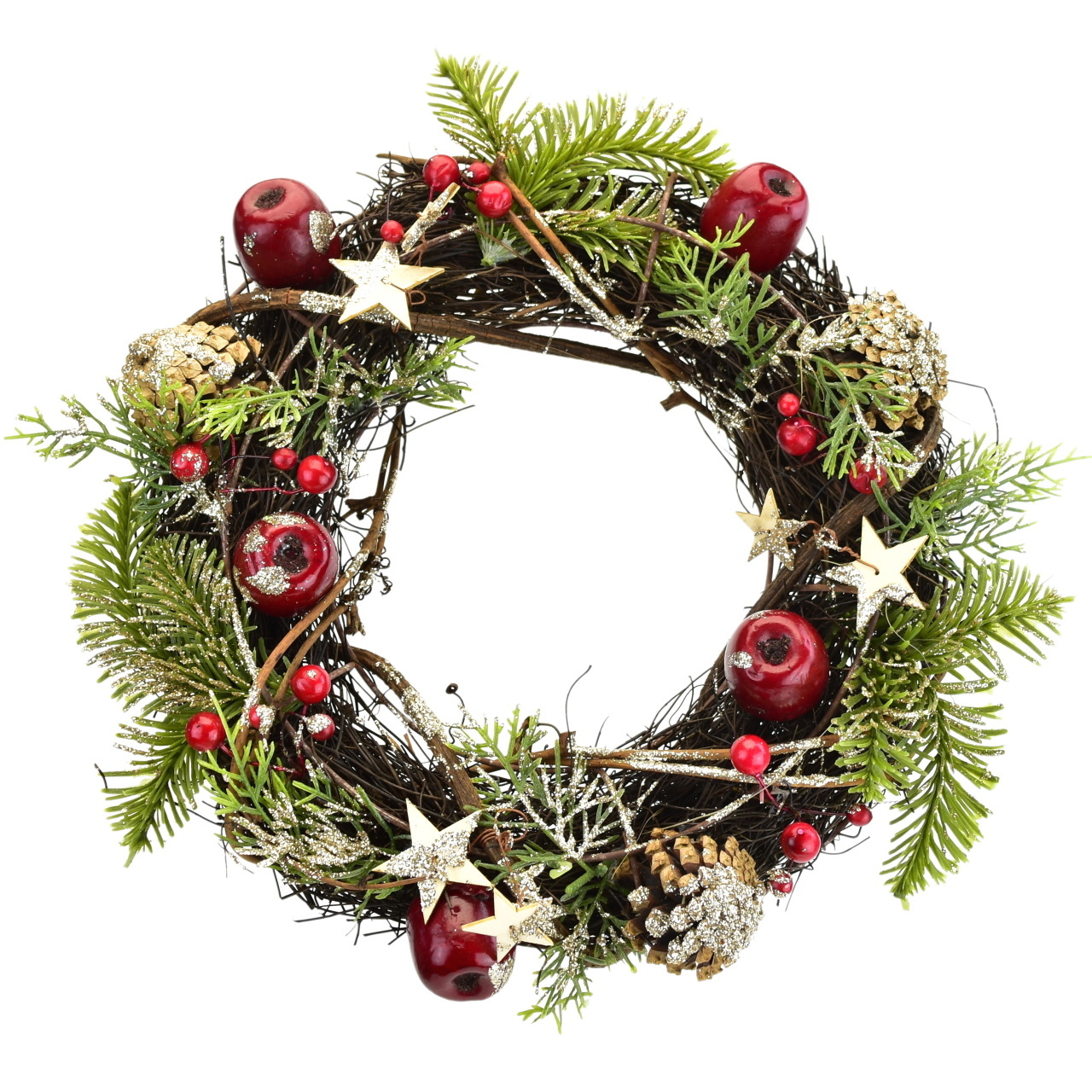 Vánoce jsou téměř tady a jak lépe vytvořit tu správnou vánoční atmosféru než s tímto úžasným přírodním věncem? Věnec je vyroben z proutí a ozdoben červenými jablíčky, hvězdičkami, bezinkami, šiškami, ratanem a větvičkami, které jsou lehce posypány zlatým glitrem. Jeho vnější průměr je 30 centimetrů, což z něj dělá ideální doplněk pro vánoční aranžmá u vás doma.