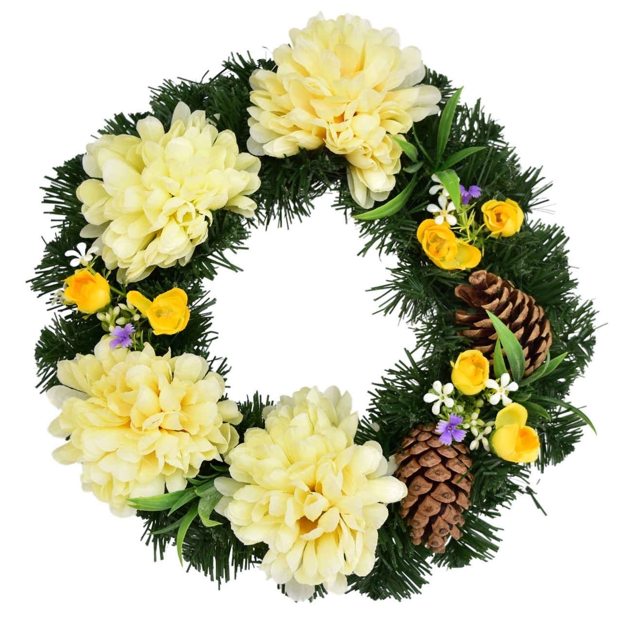 Podzimní věnec se světle žlutými chryzantémami je dokonalou výzdobou na podzimní období. Tento věnec je vyroben z umělého zeleného jehličí a je zdoben 4 květy světle žlutých chryzantém, které doplňují žluté růžičky, zelené listy, šišky a zelené větvičky s drobnými kvítky. Jeho vnější průměr činí 30 cm.