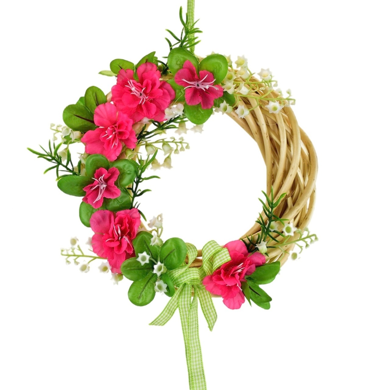 Proutěný věneček s azalkami je dokonalým jarním doplňkem pro vaši domácnost. S jeho zeleným kostkovaným mašlí a barevnými kvítky přináší přirozenou svěžest do každé místnosti. Tento věneček je vyrobený z kvalitního proutí a zdobený umělými azalkami, které vypadají úplně jako skutečné. Vnější průměr 20 cm dělá z něj ideální dekoraci pro dveře, stěny, nebo dokonce pro váš oltář nebo krb.