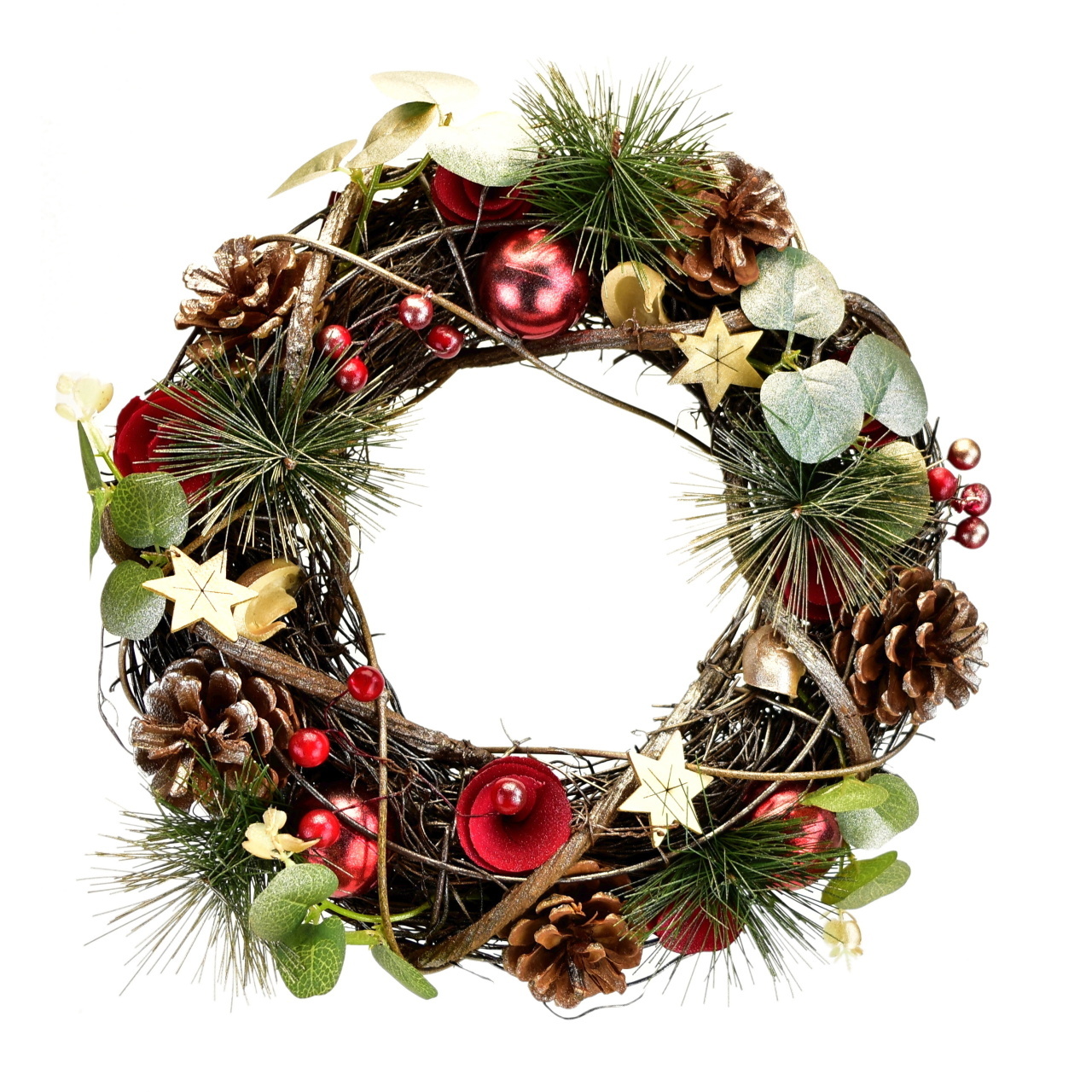 Dodáme vám první vůni Vánoc s tímto ručně vyrobeným ratanovým věncem. Zdobí ho eukaliptové větvičky, borovicové větvičky, červené kouličky, červené dřevěné kalíšky, dřevěné hvězdičky a pozlacené šišky a červené bobule. Všechno je pevně připevněno na robustním ratanovém věnci, který se bude skvěle vyjímat na vašich dveřích nebo v interiéru.