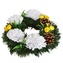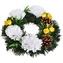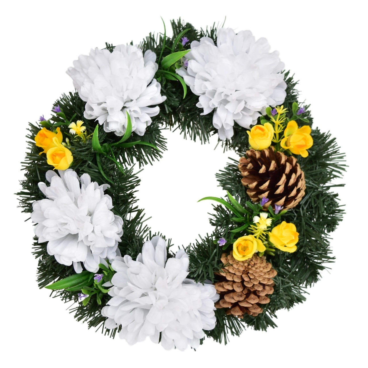 Podzimní věnec s bílými chryzantémami je dokonalou výzdobou na podzimní období. Tento věnec je vyroben z umělého zeleného jehličí a je zdoben 4 květy bílých chryzantém, které doplňují žluté růžičky, zelené listy, šišky a zelené větvičky s drobnými kvítky. Jeho vnější průměr činí 30 cm.