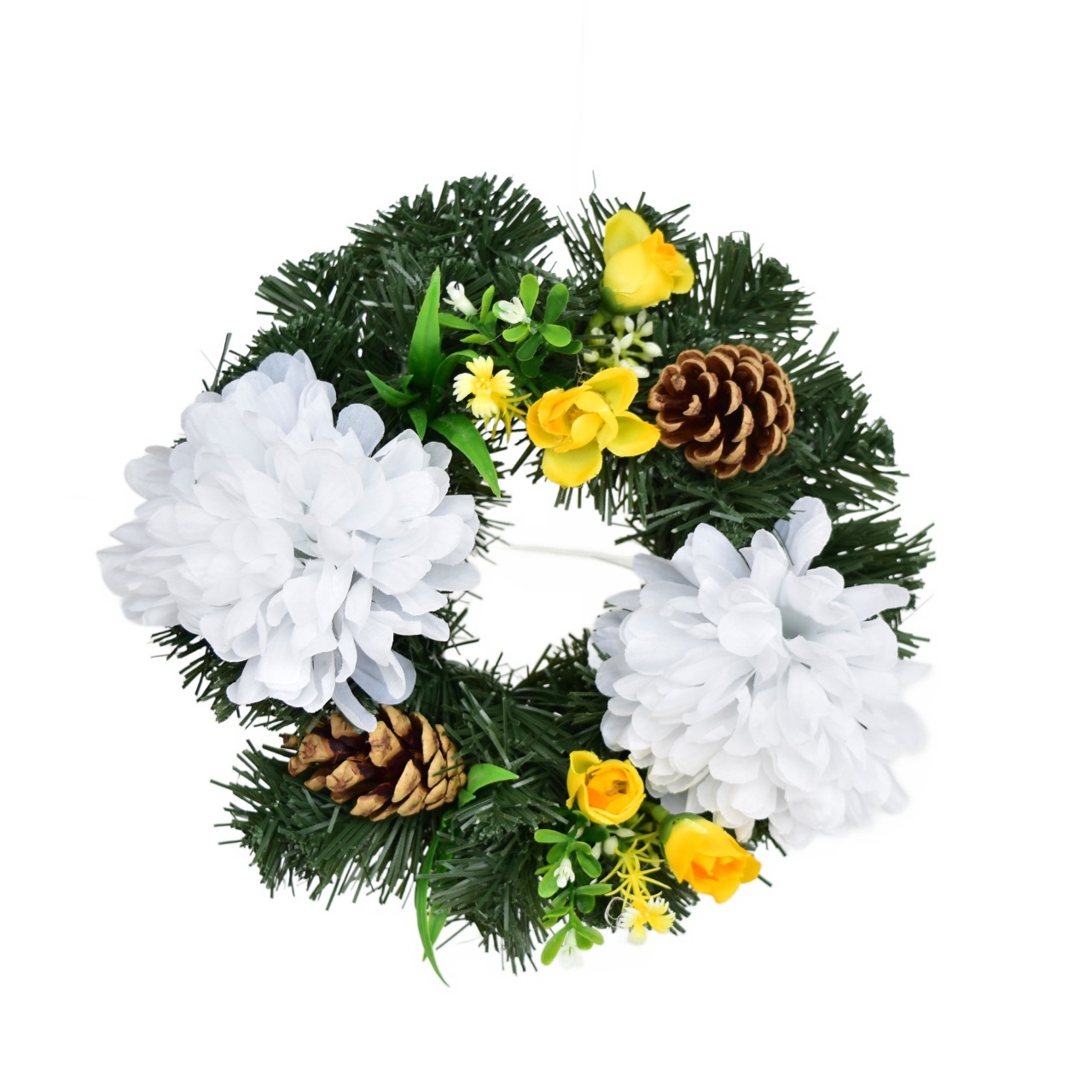 Podzimní věnec s bílými chryzantémami je dokonalou výzdobou na podzimní období. Tento věnec je vyroben z umělého zeleného jehličí a je zdoben 2 květy bílých chryzantém, které doplňují žluté růžičky, zelené listy, šišky a zelené větvičky s drobnými kvítky. Jeho vnější průměr činí 20 cm.