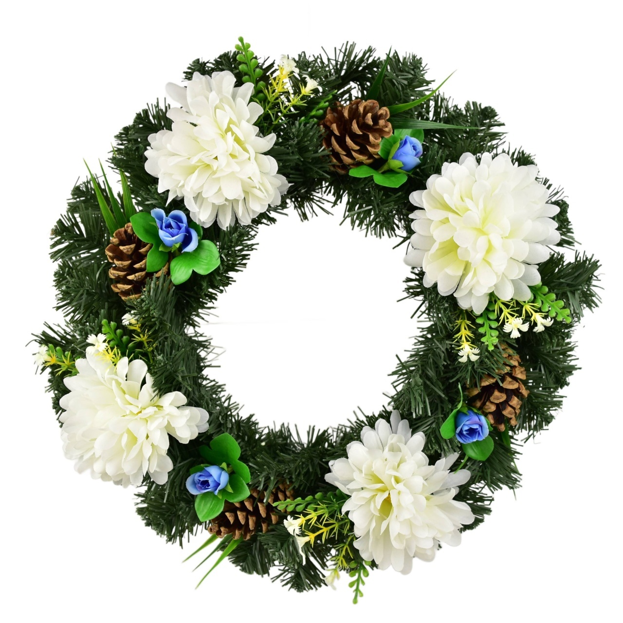Podzimní věnec s bílými chryzantémami je dokonalou výzdobou na podzimní období. Tento věnec je vyroben z umělého zeleného jehličí a je zdoben čtyřmi květy bílých chryzantém, které doplňují modré růžičky, šišky a zelené větvičky s drobnými kvítky. Jeho vnější průměr činí 35 cm.