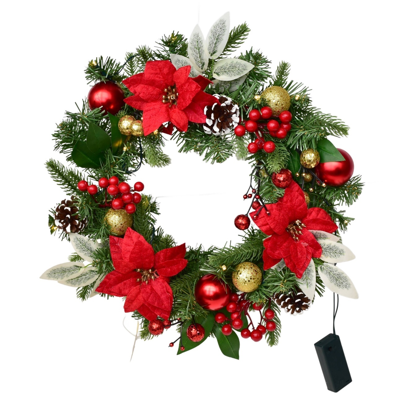Věnec s ponsetiemi s červenými a zlatými kouličkami 15×LED Ø40 cm