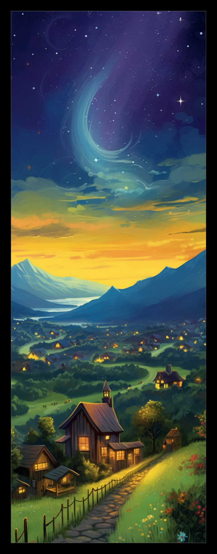 Tato záložka zachycuje malebnou venkovskou krajinu mezi horami, kde domky s komíny a rozmanitá příroda tvoří harmonickou scenérii. Každý večer, kdy zapadající slunce pomalu zalévá krajinu zlatavým světlem, se obyvatelé scházejí pod starou lípou, aby společně sdíleli příběhy, radost i hudbu. Záložka tak není pouze estetickým doplňkem vašich knih, ale i malým okénkem do života plného tradice, přátelství a ticha horského větru.