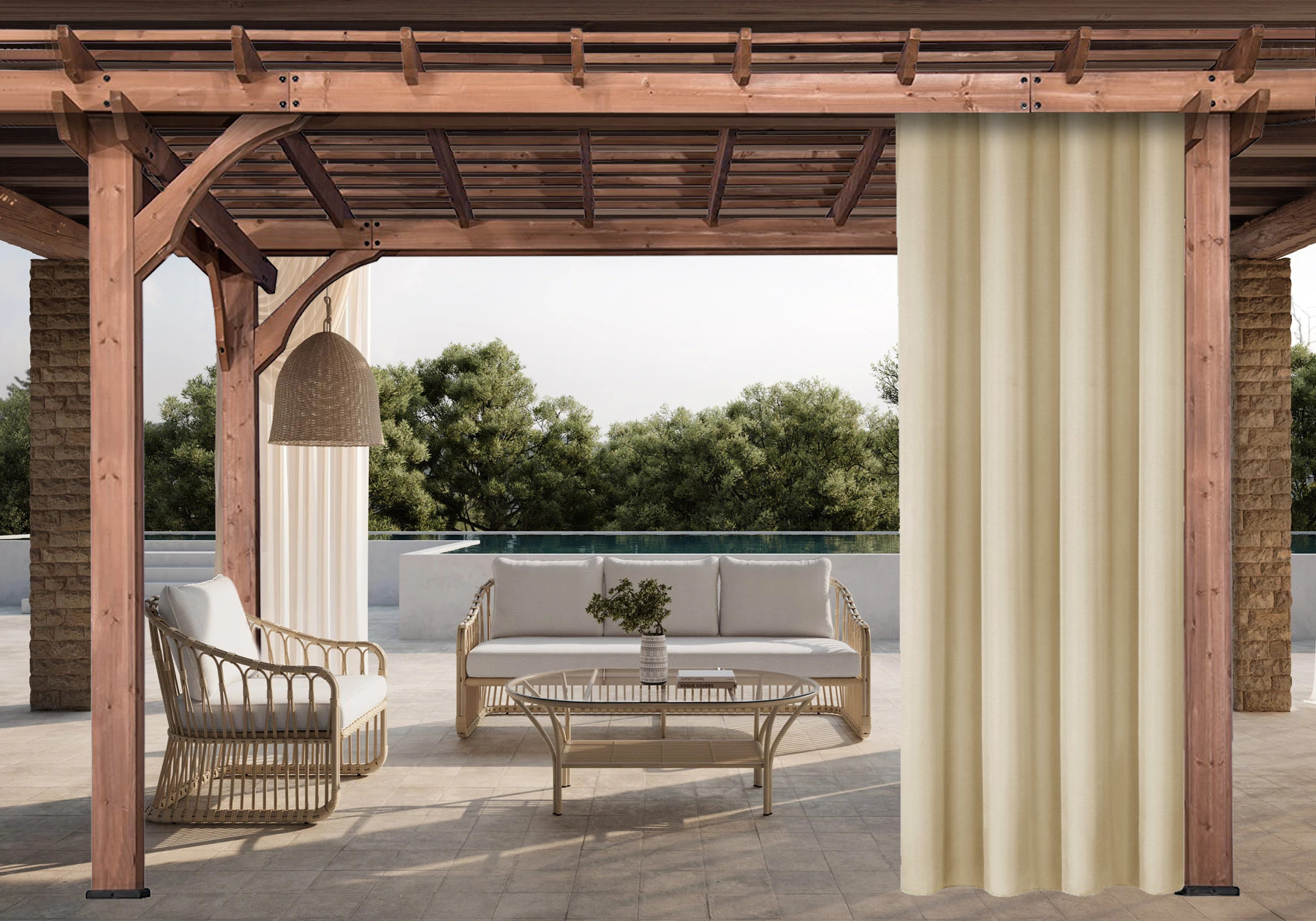 Voděodolný venkovní závěs s tunýlkem pro tyčovou gárnyž vyrobený z vysoce kvalitní látky je vhodný do pergoly, na balkón nebo do altánu. Závěs je odolný proti povětrnostním podmínkám, chrání před deštěm, eliminuje sluneční záření. Snáší nízké i vysoké teploty.