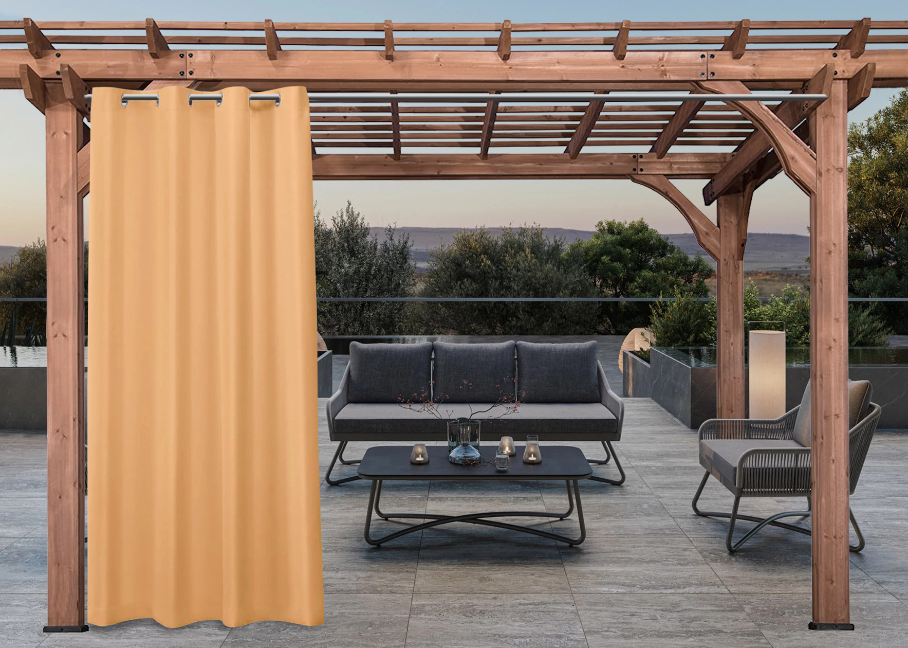 Voděodolný venkovní závěs s kroužky pro tyčovou gárnyž vyrobený z vysoce kvalitní látky je vhodný do pergoly, na balkón nebo do altánu. Závěs je odolný proti povětrnostním podmínkám, chrání před deštěm, eliminuje sluneční záření. Snáší nízké i vysoké teploty. Rozměr : šířka 155 cm, výška 200 cm. V ceně je úvaz ze stejné látky 5x155 cm. Složení 100% polyester - 191 g/m2, závěs má 8 kroužků.
