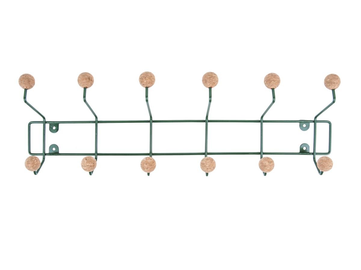Nástěnný věšák je v zeleném provedení s korkovým hnědým kulatým zakončením.