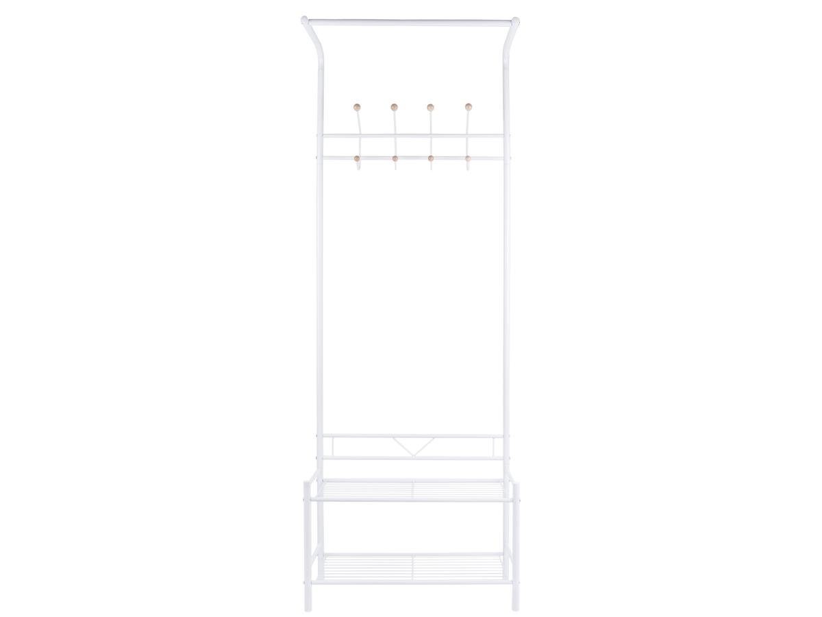 Kovový věšák v bílé barvě s háčky s dřevěným kulatým zakončením a s lavicí a se spodní přihrádkou na boty.