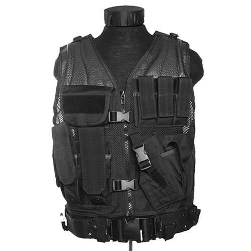 Taktická vesta typu cross-draw s opaskem. Tři kapsy na zásobníky typu M4. Tři kapsy na dva pistolové zásobníky. Pouzdro na pistoli. Užitková kapsa . Na zádech šest řad PALS vazby. Nastavitelná délkově i šířkově.