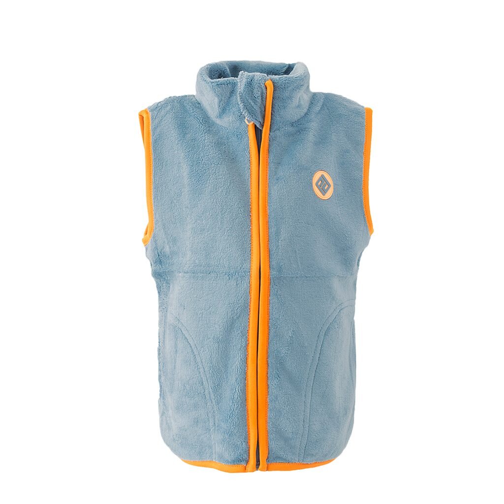 Dětská propínací chlupatá vesta v modré barvě. Stojací límec, dvě kapsy, barevné kontrastní lemy.