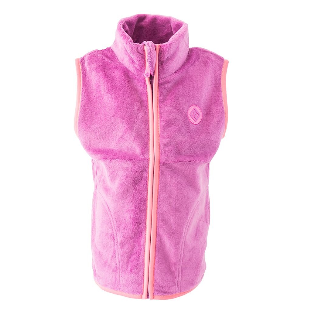 Dětská propínací chlupatá vesta ve fialové barvě. Stojací límec, dvě kapsy, barevné kontrastní lemy.