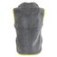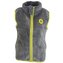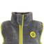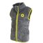 Dětská propínací chlupatá vesta v šedé barvě. Stojací límec, dvě kapsy, barevné kontrastní lemy.