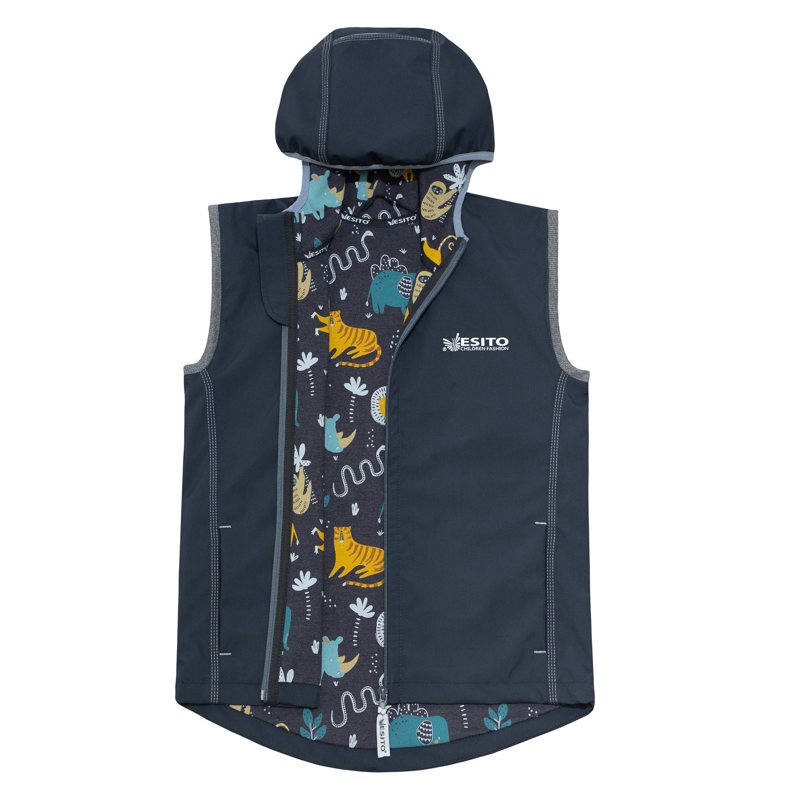 Softshellová vesta pro děti žijící nejen aktivním způsobem života. Vesta je dvojitě podšitá příjemnou bavlnou s elastanem s potiskem. Neutrální dívčí i chlapecký motiv potisku Safari. Vesta má 2 reflexní prvky při snížené viditelnosti formou svítících termotransferů na předním díle a zádech. Softshellová vesta má prodloužená záda, pružnou kapuci, silné poutko na bezproblémové zavěšení i na široký věšák, velké krytí zipu a pohodlné velké kapsy, kam si dítě schová obě ruce.
