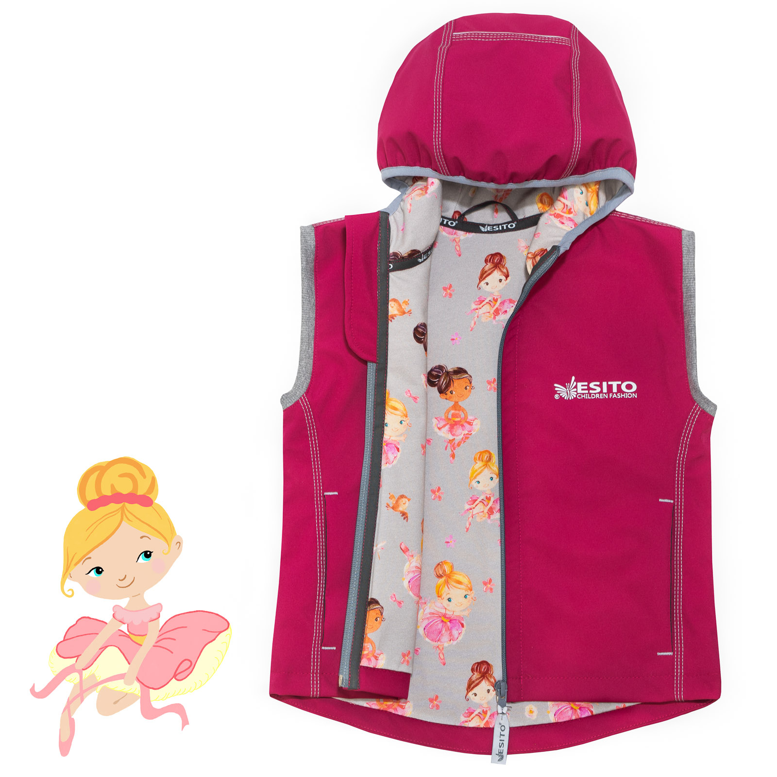 Softshellová vesta pro děti žijící nejen aktivním způsobem života. Vesta je dvojitě podšitá příjemnou bavlnou s elastanem s potiskem. Dívčí motiv potisku baletky. Vesta má 2 reflexní prvky při snížené viditelnosti formou svítících termotransferů na předním díle a zádech. Softshellová vesta má prodloužená záda, pružnou kapuci, silné poutko na bezproblémové zavěšení i na široký věšák, velké krytí zipu a pohodlné velké kapsy, kam si dítě schová obě ruce.
