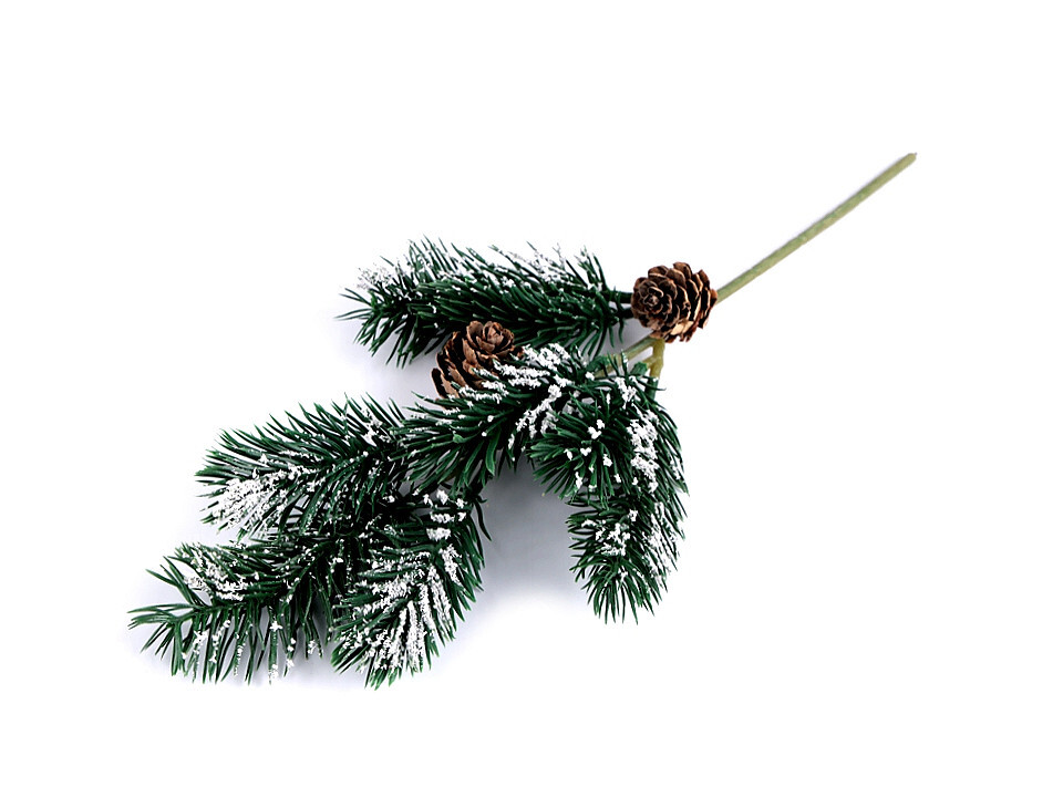 Dekorační větvičku smrku doplňují přírodní šišky. Je lehce posypaná umělým sněhem. Díky drátu můžete větvičku tvarovat.Použití: Větvičku využijete na vánoční a zimní aranžování. Vynikne na věncích, v truhlících, ale i v ikebanách a vázách. číst celé