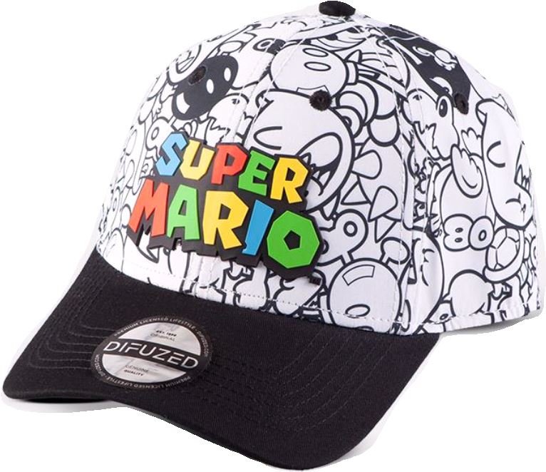 Atraktivní černo-bílá baseballová kšiltovka s barevným logem Super Mario na čele z počítačové hry Nintendo.