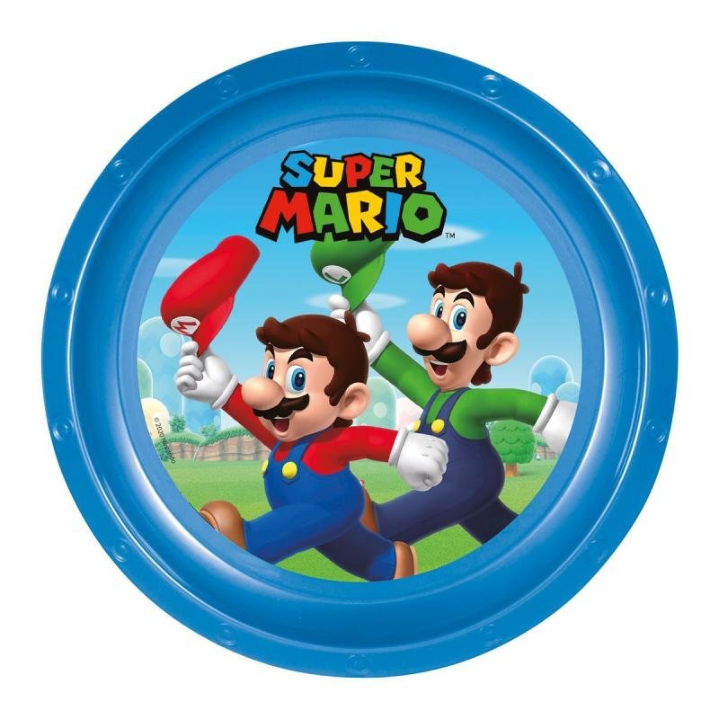 Dětský plastový talíř v modré barvě s motivem kreslené postavičky instalatéra Super Maria.