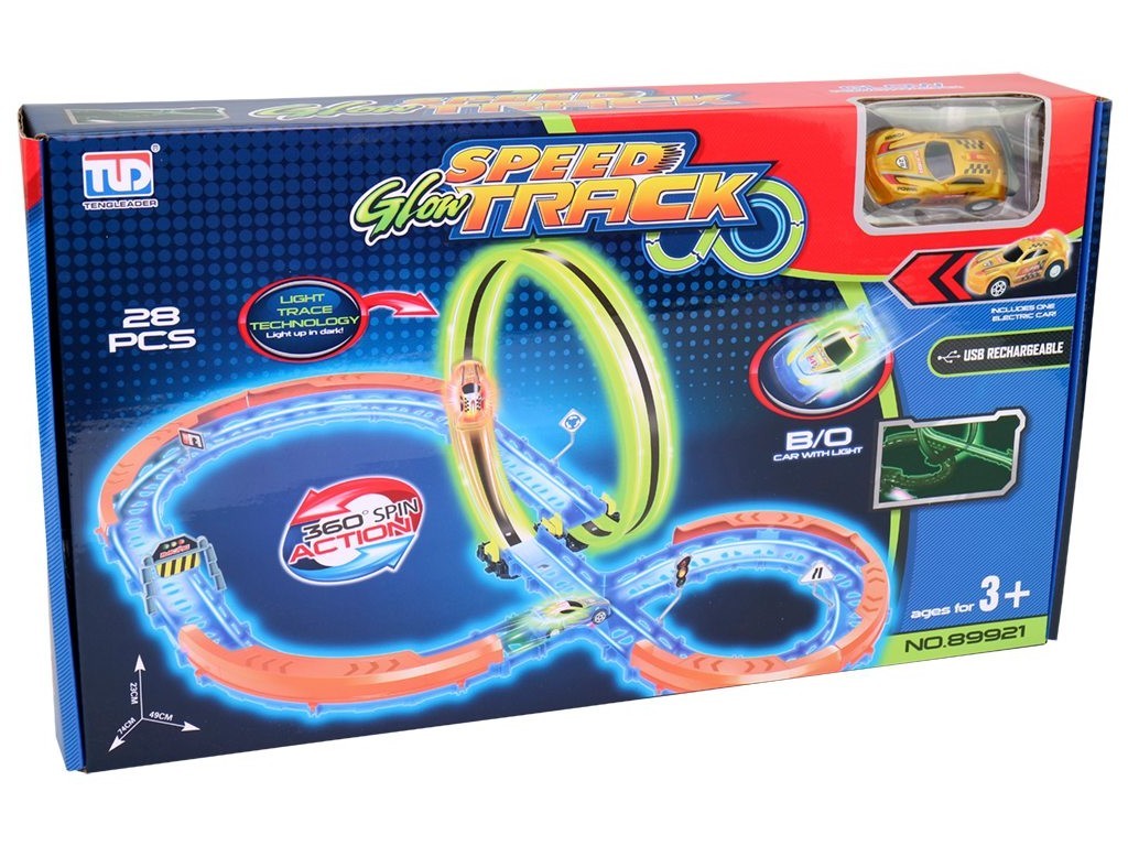 Autodráha - svítící ve tmě, 1 auto, na baterie, 28 ks, 74 x 49 x 23 cmHračka je určena pro děti 3+.Rozměr hračky je 74 x 49 x 23 cm.Materiál hračky je plast.Balení hračky je window box.Produkt je určený pro kluky.Ke zprovoznění produktu jsou potřeba 1 Li-3,7V baterie.Baterie jsou součástí balení.