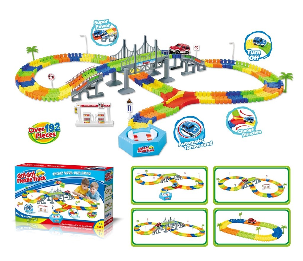 Variabilní dráha 192 dílů s točnou. Součástí jedno autíčko, lanový most a točna, která autíčko automaticky otočí zpět na dráhu. Provoz na 2×1,5V AA tužkové baterie - nejsou součástí. V nabídce červené/modré autíčko. Jednoduché na sestavení. číst celé