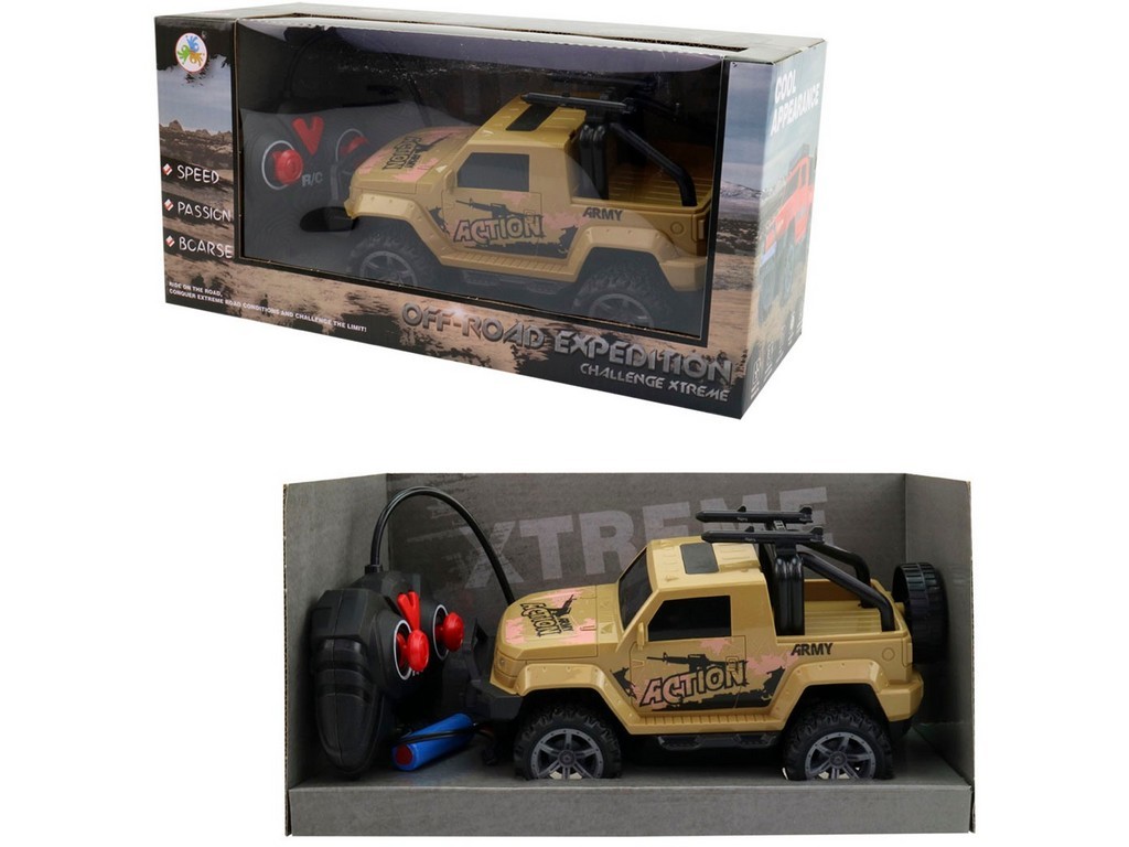 Auto jeep vojenský na dálkové ovládání, čtyřkanál, 22 x 9 x 11 cmHračka je určena pro děti 3+.Rozměr hračky je 22 x 9 x 11 cm.Materiál hračky je plast.Balení hračky je box.Produkt je určený pro kluky.Ke zprovoznění produktu jsou potřeba 1/2 Li-3,7V/AA baterie.Balení obsahuje baterie pouze do hračky.
