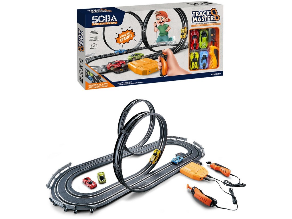Autodráha, délka 394 cm, 56 x 29 x 5,5 cm. Skvělá autodráha pro všechny milovníky rychlé jízdy o celkové délce dráhy 394 cm. Stačí dráhu poskládat a závod může začít. Závodit se dá celkem na dvou tratích, které se dají ovládat 2 ovladači. Celý okruh závodu může znesnadnit několik prudkých zatáček, ale správný závodník zvládne vše a dokáže si poradit. Balení obsahuje 4 různě barevná závodní auta, která barva bude ta tvá vítězná? Uvidíme v cíly.Technické specifikace :Délka tratě 394 cm, 4 autíčka, 2 ovladače.Rozměry dráhy: 90 x 43 x 31 cm (při složení podle návodu).Rozměr balení: 56 x 29 x 5,5 cm.Materiál: plast.Napájení: 6 x 1,5V AA (baterie nejsou součástí balení) nebo síťový adaptér (součástí balení).Doporučený věk: 6+