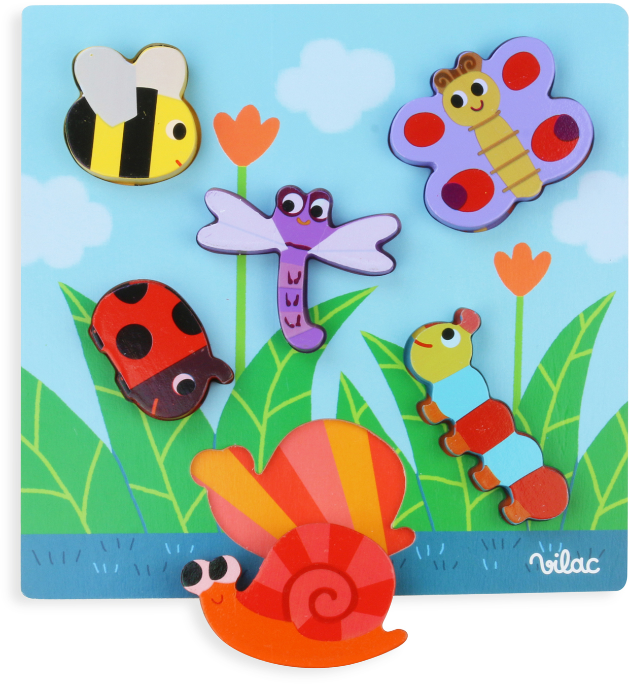 Barevné dřevěné vkládací puzzle s tematikou louky. Šest rozlišných zvířátek po jejichž odebrání děti uvidí barevný vzor, dle kterého budou vědět kam jaké zvíře patří. Hračky Vilac mají značku francouzské agentury ADEME, to znamená, že tyto dřevěné hračky jsou vyráběny ekologicky. Šetří životní prostředí, neznečišťují půdu, vodu a vzduch, neplýtvají energiemi. Již více než 100 let plní značka Vilac dětské sny. Společnost Vilac sídlí hluboko v srdci pohoří Jura, obklopena horami, jezery a lesy. Tato francouzská společnost vyrábí od roku 1911 dřevěné hračky v klasickém, starodávném stylu s moderními barvami a vzory. Hračky Vilac jsou jedinečné, nikdy nevyjdou z módy a dokáží okouzlit všechny generace. Vilac pomáhá utvářet dětskou představivost svými radostnými ilustracemi či dizajny a reinterpretací klasických hraček, které se jen tak neopotřebují. Děti dostávají na Vánoce a narozeniny spousty hraček, většina z nich je však nezaujme na dlouhou dobu, láska k hračce se nenaplní. Dřevěné hračky Vilac vzbuzují vášeň i o 50 let později, když jako dospělí náhodou najdete v podkroví hračky, které jste jako děti milovali. Vilac již 100 let propojuje děti s hračkami, které si oblíbí a váží si jich. A proč je děti tak milují? To zůstává tajemstvím firmy Vilac.