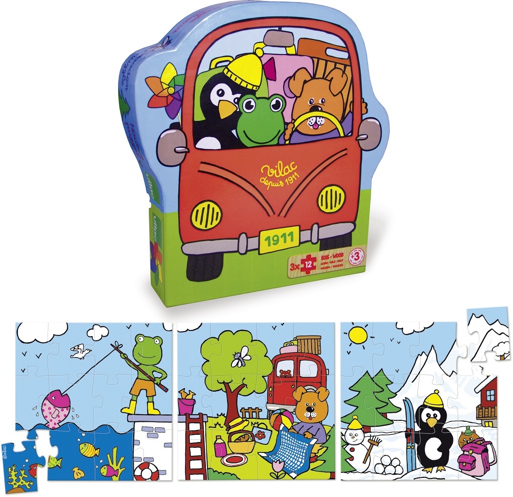 V dřevěném boxu najdete puzzle s ilustracemi prázdninových činností. Obsahuje 3 puzzle, které se dají postavit vedle sebe a tvoří tak jeden velký obrázek. Hračky Vilac mají značku francouzské agentury ADEME, to znamená, že tyto dřevěné hračky jsou vyráběny ekologicky. Šetří životní prostředí, neznečišťují půdu, vodu a vzduch, neplýtvají energiemi. Již více než 100 let plní značka Vilac dětské sny. Společnost Vilac sídlí hluboko v srdci pohoří Jura, obklopena horami, jezery a lesy. Tato francouzská společnost vyrábí od roku 1911 dřevěné hračky v klasickém, starodávném stylu s moderními barvami a vzory. Hračky Vilac jsou jedinečné, nikdy nevyjdou z módy a dokáží okouzlit všechny generace. Vilac pomáhá utvářet dětskou představivost svými radostnými ilustracemi či dizajny a reinterpretací klasických hraček, které se jen tak neopotřebují. Děti dostávají na Vánoce a narozeniny spousty hraček, většina z nich je však nezaujme na dlouhou dobu, láska k hračce se nenaplní. Dřevěné hračky Vilac vzbuzují vášeň i o 50 let později, když jako dospělí náhodou najdete v podkroví hračky, které jste jako děti milovali. Vilac již 100 let propojuje děti s hračkami, které si oblíbí a váží si jich. A proč je děti tak milují? To zůstává tajemstvím firmy Vilac.