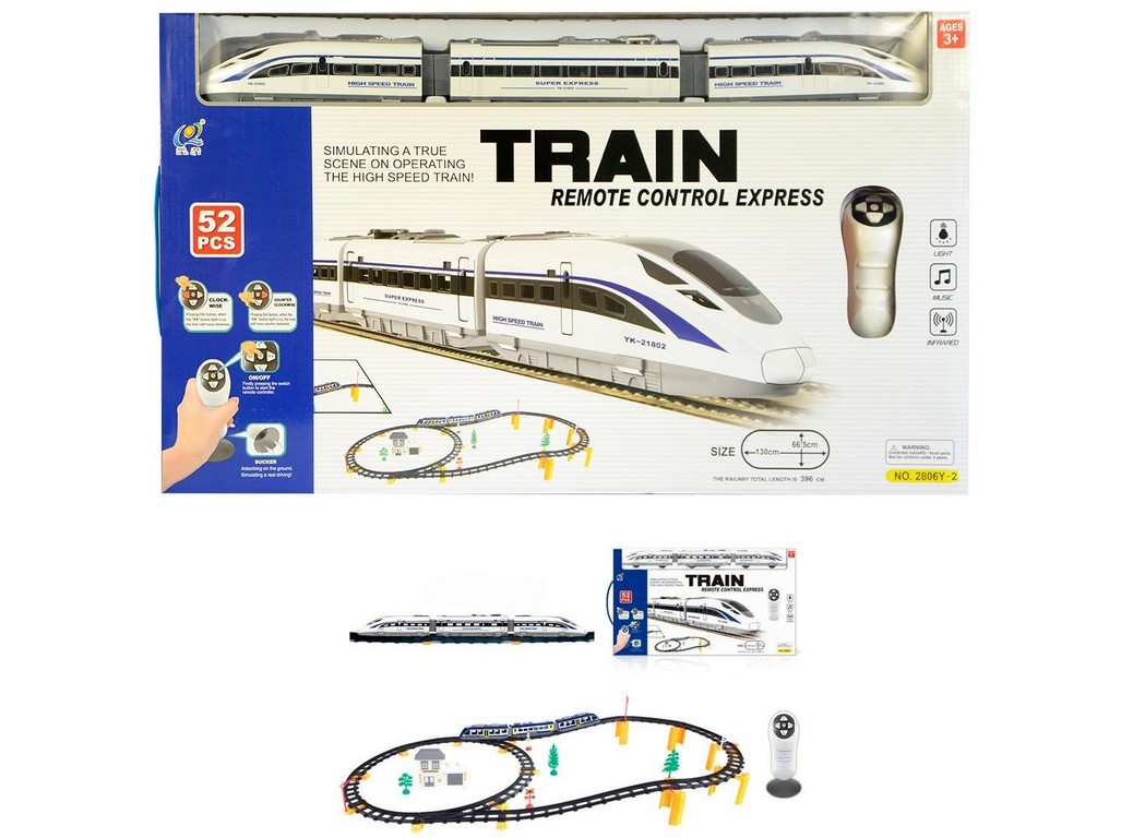 Rychlovlak na dálkové ovládání. Vlaková souprava je ovládáná infračerveným světlem. Součástí jsou zvukové a světelné doplňky. K napájení rychlovlaku i ovladače je potřeba celkem 5 baterií typu AA 1,5V.Celková délka sestavené dráhy je 396 cm. Sestavený jednoduchý ovál pak bude mít rozměry 130 x 65 cm. Sada obsahuje 52 dílů. Rozměry boxu jsou 60 x 35 x 5 cm. Vhodné pro věk 3+.