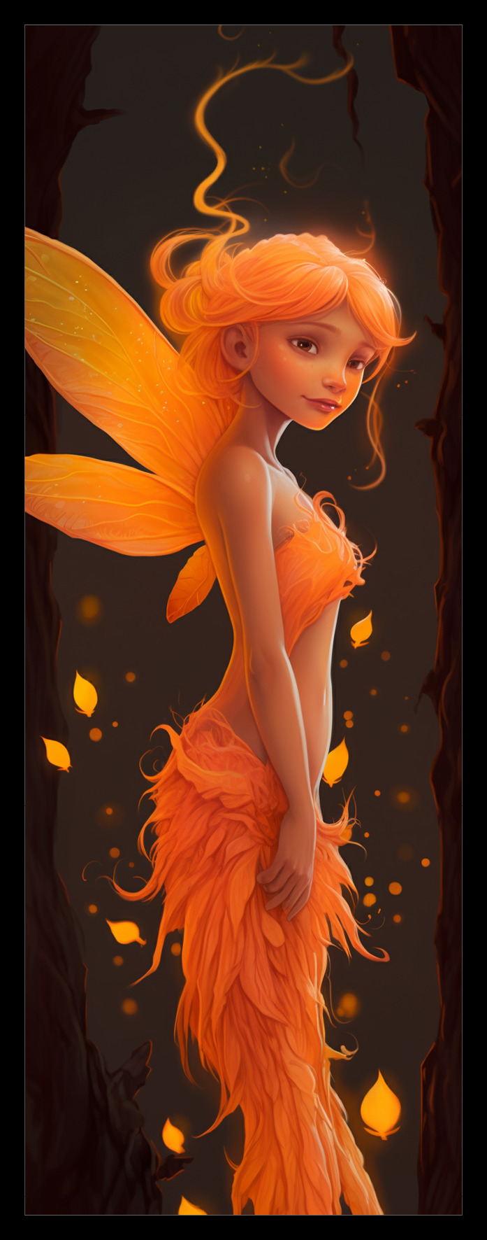 Na sopečném ostrově, kde se země otřásá a vzduch je plný žhavých výparů, žije Ohnivá víla. Její plamenná křídla a šaty jsou tvořeny samotným ohněm, který propůjčuje její moci kontrolu nad silou sopek a žhnoucí lávou. Tato víla je symbolem síly a odvahy, která chrání svůj domov i jeho obyvatele před nebezpečím sopečných erupcí.