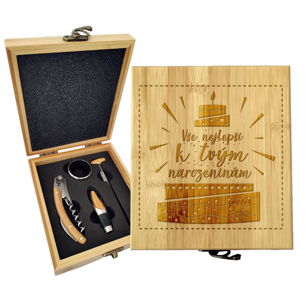 Dárková sada na víno v dřevěné krabičceIdeální dárek pro každého milovníka vína je dřevěná krabička se sadou na víno s originálním gravírovaným věnováním.Sada obsahuje 4 kusy a krabička je vyrobená z bambusu.Rozměry: 147×168×49 mm