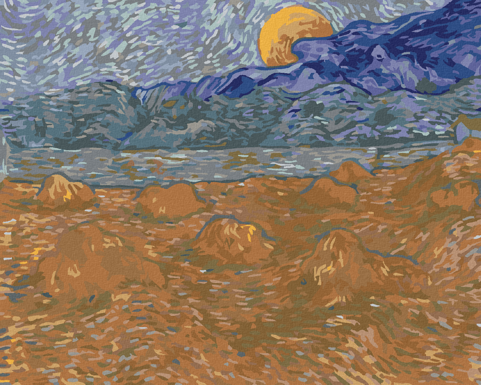 Malování podle čísel - KRAJINA S PŠENIČNÝMI SNOPY A VYCHÁZEJÍCÍM MĚSÍCEM (VINCENT VAN GOGH) - 40x50 cm, bez rámu a bez vypnutí p