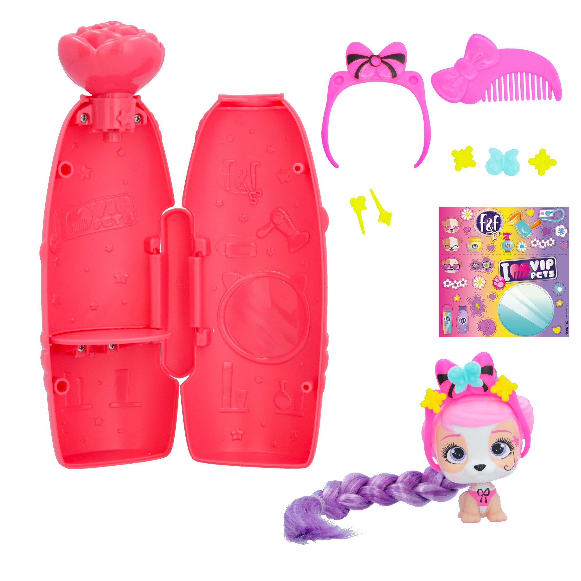 VIP Pets mini fans s novým jarním tématem a voňavými vlasy! Speciální nový obal se otevírá způsobem vystřelení konfet - k otevření balení je potřeba použít tlačítko ve tvaru malého květu - tím se konfety uvolní. Všechny nové doplňky s jarní tematikou, 6+ překvapení: 1 mini VIP pet, 1 hřeben, 2 doplňky do vlasů s květinovým dekorem, 1 sběratelský list, 1 arch s nálepkami, 1 mini hrací souprava do vlasů. Vzácný pejsek z této série obsahuje o 1 doplňek navíc. Smíchej a slaď květinové doplňky a vytvoř si květinovou korunu na míru.