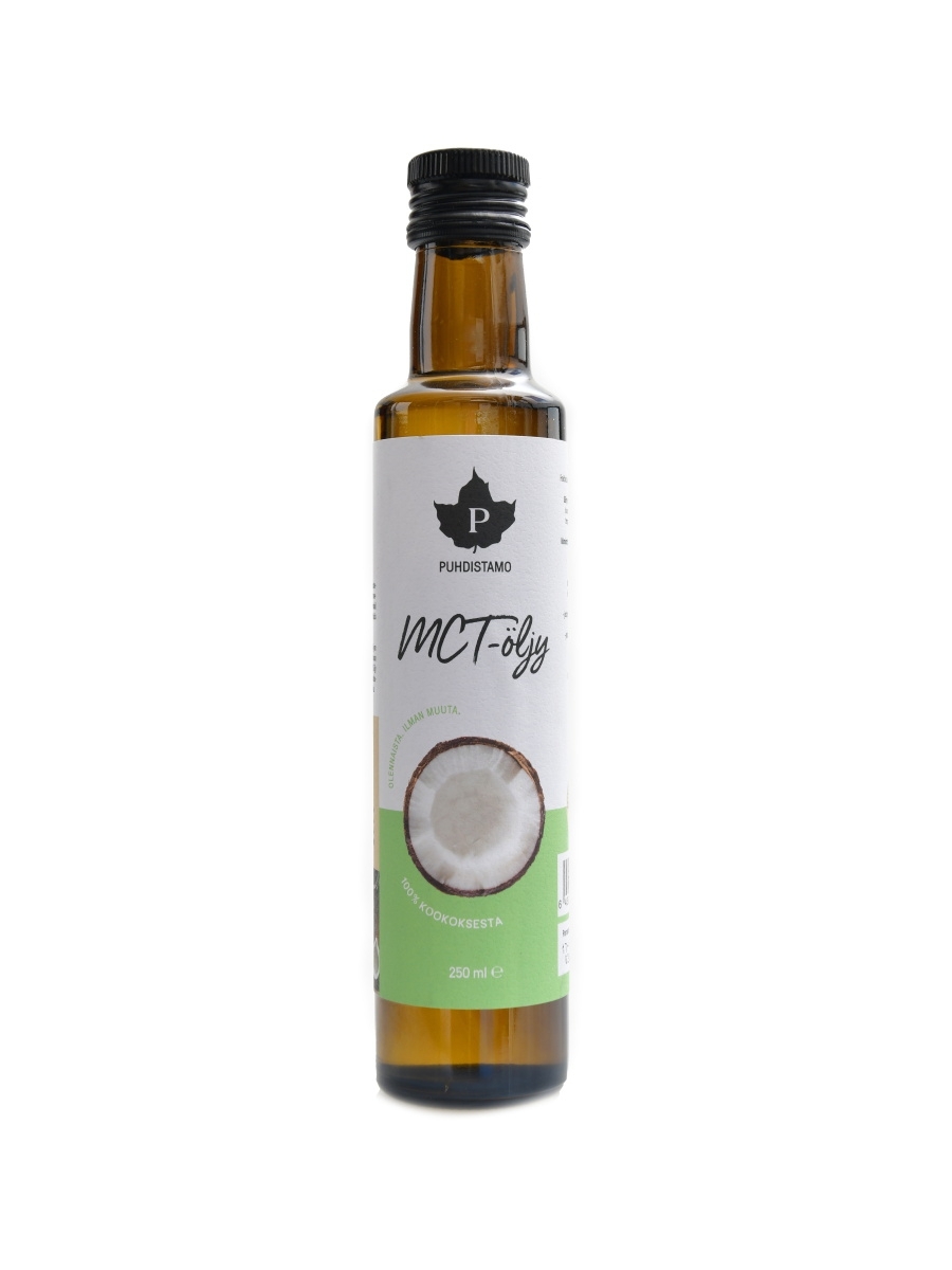 Triglyceridy se středně dlouhým řetězcem neboli MCT tuky se přirozeně vyskytují v kokosu, odkud se získávají frakční destilací. Mají dvakrát větší energetickou hodnotu než sacharidy, avšak jsou tělem využívány jiným způsobem než klasické tuky - jsou využívány jako palivo pro svaly i mozek, ale neukládají se do tkání. MCT olej Puhdistamo obsahuje 60 % kyseliny kaprylové (C8) = zdroj velmi rychlé energie, a 40 % kyseliny kaprinové = zdroj středně rychlé energie + podpora vitality.